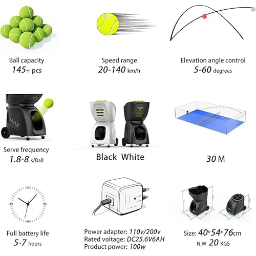 - Engineered for extended play, this Tennis Ball Machine holds over 110 balls and runs for 5–8 hours on a single charge. Ideal for marathon training sessions, it ensures consistent performance whether you’re a beginner or an advanced player.